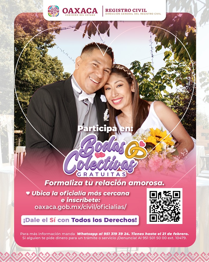 El Gobierno del Estado a través de la Dirección del Registro Civil de Oaxaca inició la convocatoria para las Bodas Colectivas Gratuitas 2025 “Dale el sí con todos los derechos”, dirigida a las parejas mayores de 18 años, que viven en concubinato, y a quienes tienen hijas e hijos y no están casadas.