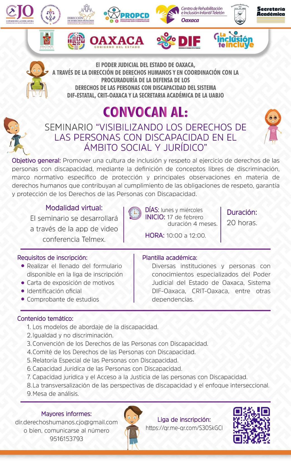 Para mayores informes, las personas interesadas pueden comunicarse al teléfono: 951 615 37 93 o a la cuenta de correo electrónico: dir.derechoshumanoscjo@gmail.com.