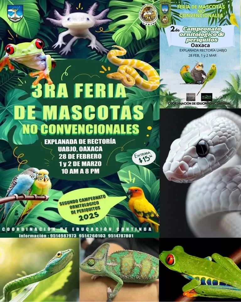 La Universidad Autónoma Benito Juárez de Oaxaca (UABJO) abrirá sus puertas a la tercera edición de la Feria de Mascotas No Convencionales, un evento organizado por la Facultad de Medicina Veterinaria y Zootecnia. Del 28 de febrero al 2 de marzo, de 10:00 a 19:00 horas, Ciudad Universitaria recibirá a expositores de distintos estados del país y a visitantes interesados en conocer especies poco comunes.