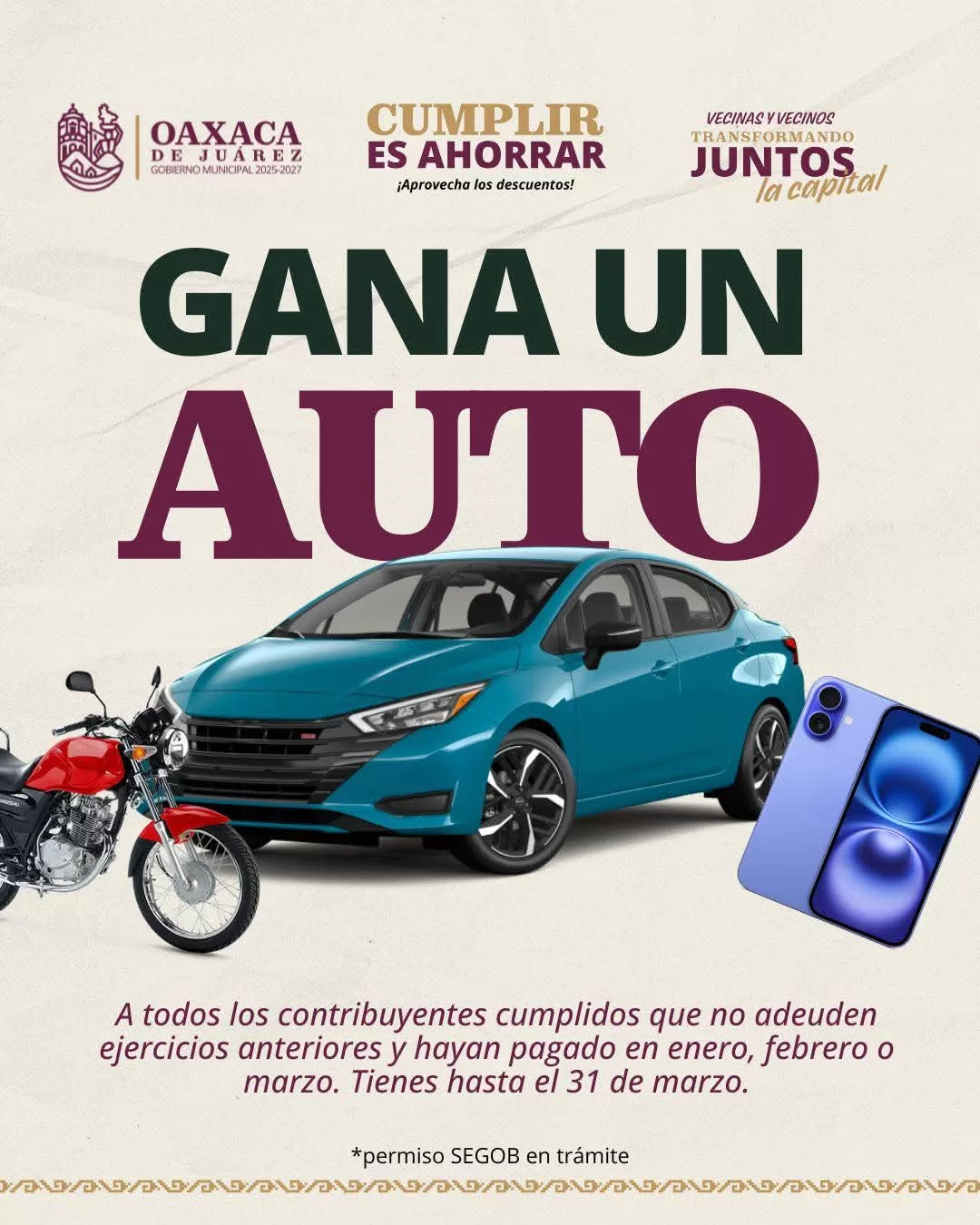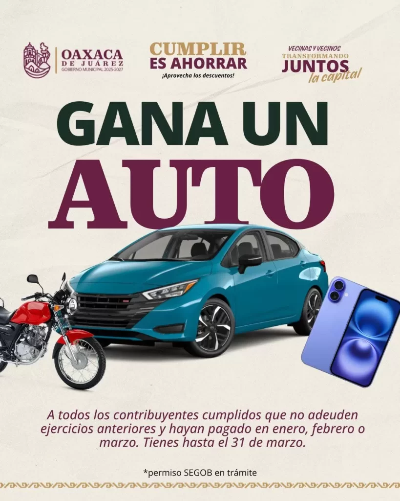 El gobierno municipal de Oaxaca de Juárez ha lanzado el sorteo “Vecino Cumplido – Vecino Comprometido”, con el que busca incentivar el pago del impuesto predial y los derechos por comercio establecido. Quienes cumplan con esta obligación antes del 31 de marzo podrán participar automáticamente en el sorteo.