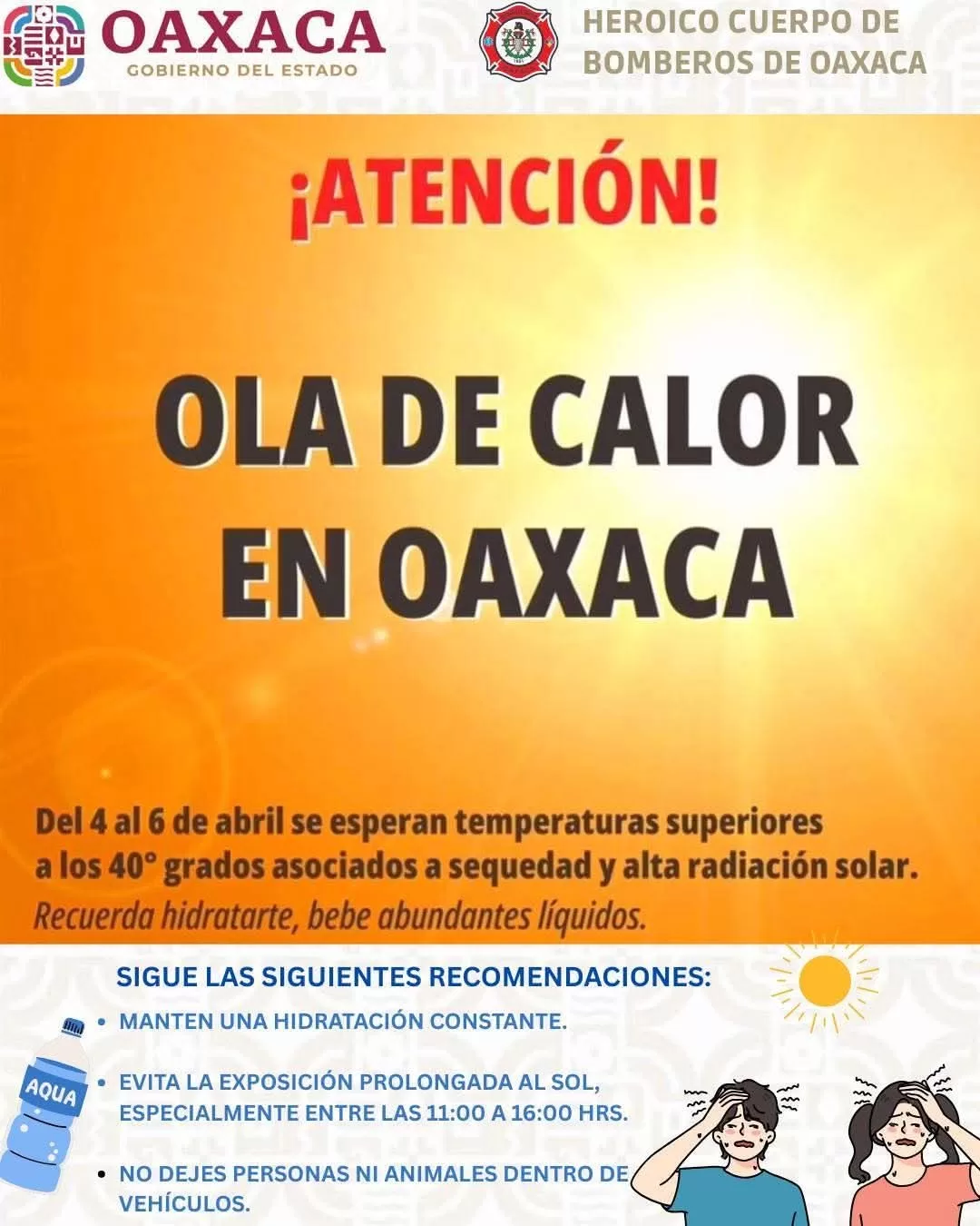 Las autoridades meteorológicas exhortan a la población a tomar precauciones ante el riesgo que representa el calor extremo. Recomiendan evitar la exposición prolongada al sol, mantenerse hidratado, utilizar ropa ligera y de colores claros, y no dejar personas ni mascotas dentro de vehículos cerrados. Asimismo, se hace un llamado a seguir atentos a los avisos oficiales y a las recomendaciones de Protección Civil.