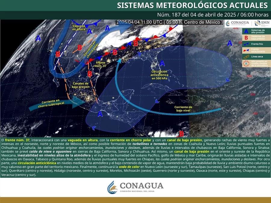 De acuerdo con el pronóstico del tiempo emitido por la Comisión Nacional del Agua (Conagua), estas condiciones meteorológicas son originadas por una intensa circulación anticiclónica en niveles medios y altos de la troposfera; un peligro para la salud de las personas y la detonación de incendios forestales, pastizales y basureros.