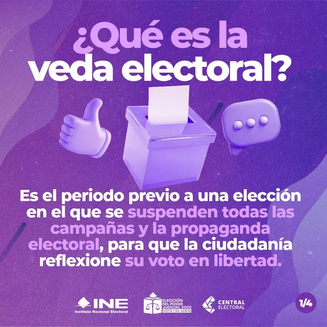 Conforme al artículo 251 de la Ley General de Instituciones y Procedimientos Electorales (LGIPE), durante los tres días previos a la jornada electoral que se celebrará el domingo 1 de junio queda suspendida toda propaganda electoral, así como la difusión de encuestas o actos de proselitismo. El objetivo de esta medida es garantizar un periodo de reflexión que permita a la ciudadanía emitir un voto libre e informado.