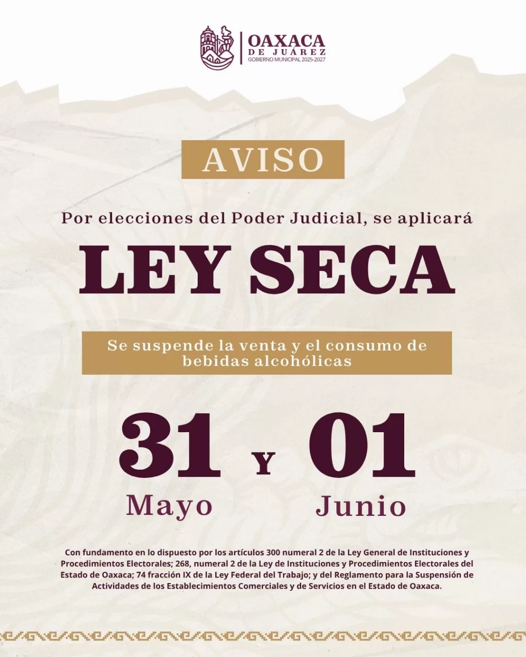 Con fundamento en la normatividad vigente, se aplicará Ley Seca en todo el territorio municipal a partir de las 00:00 horas del sábado 31 de mayo y hasta las 23:59 horas del domingo 1 de junio. Esta disposición prohíbe la venta y el consumo de bebidas alcohólicas durante el periodo señalado.