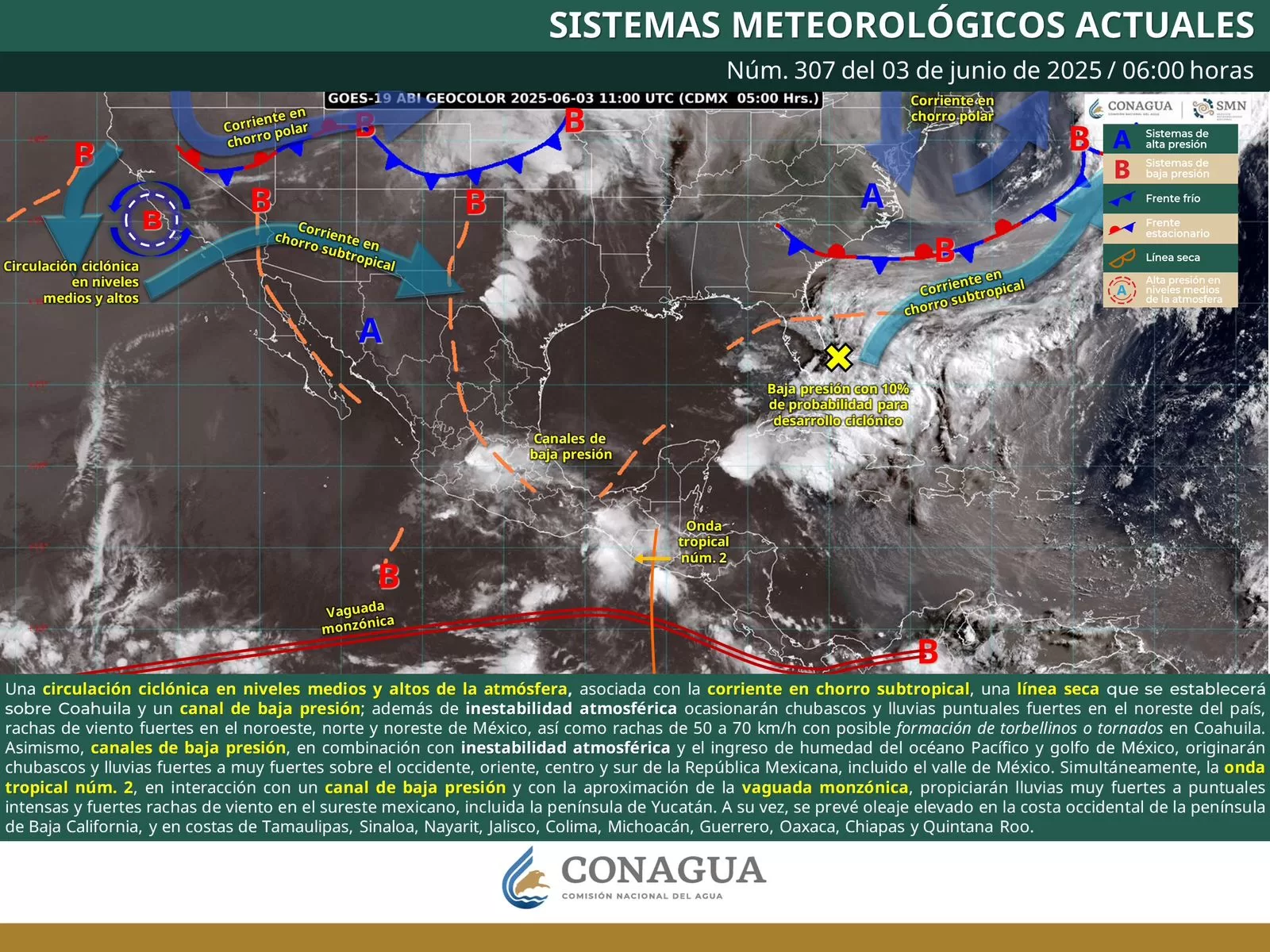 Oaxaca de Juárez, Oax. 3 de junio de 2025.- La Coordinación Estatal de Protección Civil y Gestión de Riesgos (CEPCyGR) informa que, este martes, se mantendrá la inestabilidad provocada por el flujo de humedad de la vaguada monzónica hacia el interior de la entidad, en combinación con el paso de la onda tropical número 2, lo que desarrollará nubosidad baja y media en gran parte de Oaxaca.