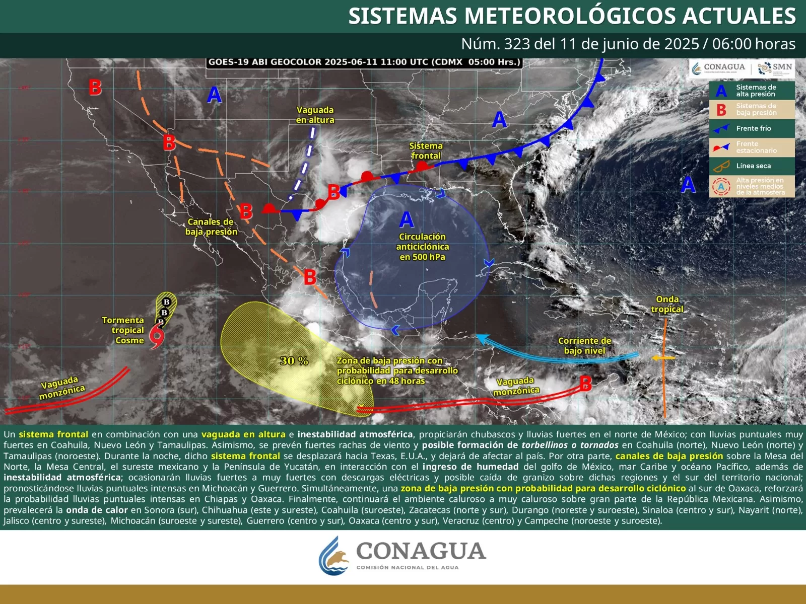 Esto, debido a una amplia zona de baja presión con probabilidad de desarrollo ciclónico al sur del Golfo de Tehuantepec en combinación con otros eventos.