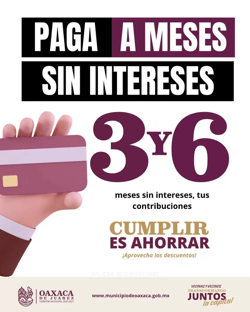 Oaxaca de Juárez, Oax., 16 de junio de 2025.– El Municipio de Oaxaca de Juárez recuerda a la ciudadanía que las contribuciones municipales pueden realizarse a 3 y 6 meses sin intereses con tarjetas de crédito participantes, como parte de una estrategia permanente para facilitar el cumplimiento de las obligaciones fiscales.