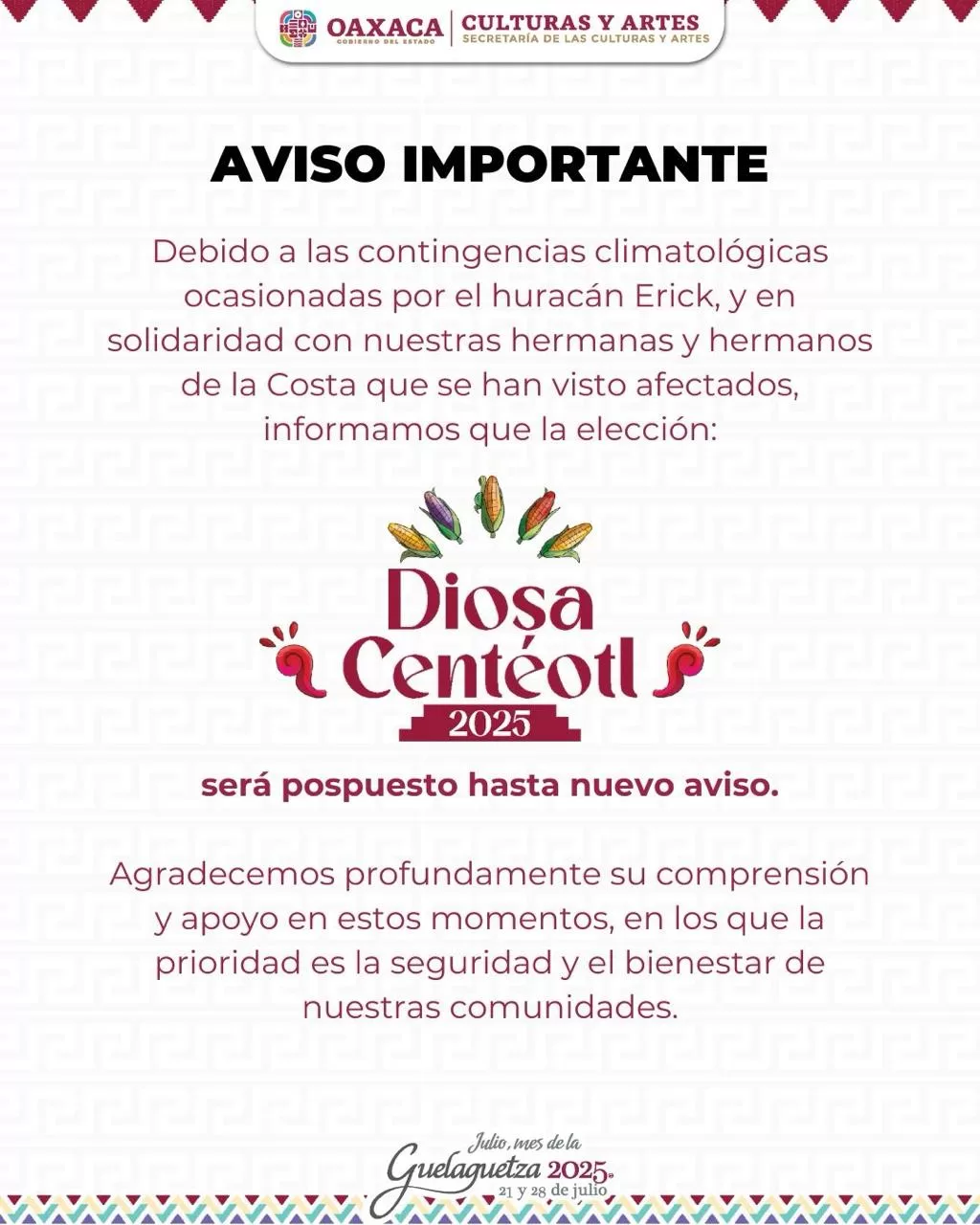 Oaxaca de Juárez, Oax. 19 de junio de 2025.- El Consejo Estatal de Protección Civil, a través de la Secretaría de las Culturas y Artes (Seculta), informa que, ante el impacto del huracán Erick en las costas de Oaxaca, el proceso de selección de la representante de la Diosa Centéotl 2025, previsto para este 20 y 21 de junio; será reprogramado.
