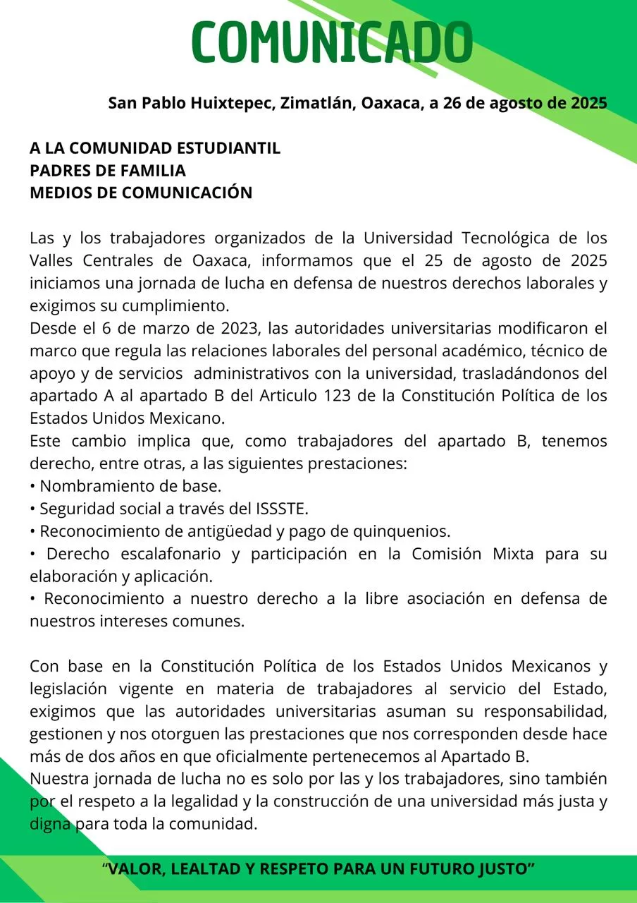 Trabajadores y trabajadoras de la Universidad Tecnológica de los Valles Centrales de Oaxaca (UTVCO) hicieron pública su inconformidad ante la falta de cumplimiento de las prestaciones establecidas en el Apartado B de la Ley Federal de los Trabajadores al Servicio del Estado, mismas que, señalaron, no han sido otorgadas desde hace más de dos años.